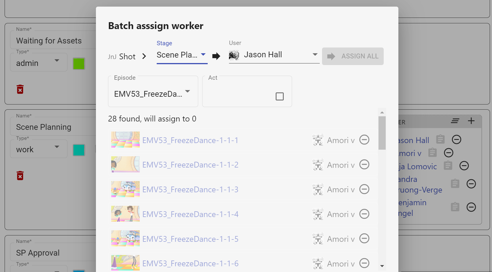 Admins can batch assign users to stages across multiple shots using the batch assign interface. Use the fields to filter shots and then assign.