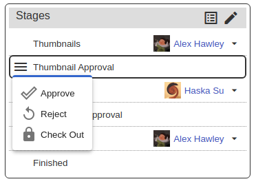 When a Resource is created, it is set to the initial Stage that is defined by its Resource Category. Members, Supervisors, and Admins can control the Stage movement in the Resource page or Shot page.
