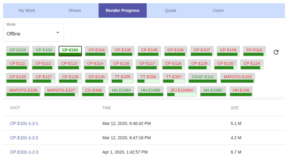All Episodes that have rendering turned on are listed below the "Mode" drop-down menu. Each Episode has a progress bar for a quick view at its status. Click on the Episode box to list the Shot rendering status for that Episode."