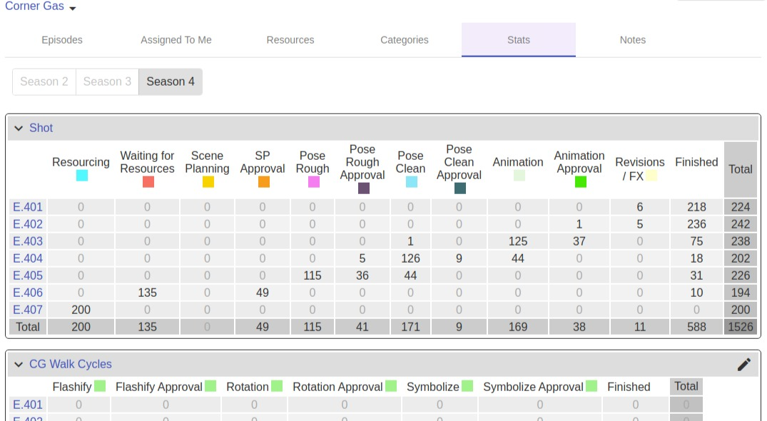 This page has expandable boxes for each Resource Category. When expanded, these boxes reveal a table where that Resource category is divided by Episode and Resource stage. From this table, you can quickly see how many Resources for this category are in each stage for each Episode.