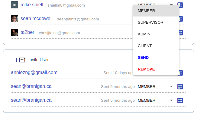 To resend an invitation email, an Administrator can open the Members tab on the Profile Page, locate the user, click the drop-down menu with their Role, and select the "SEND" option.