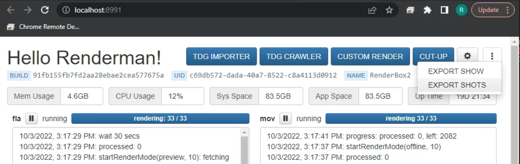 On the Renderman Page, click the "Export Shots" button within the kebab menu.