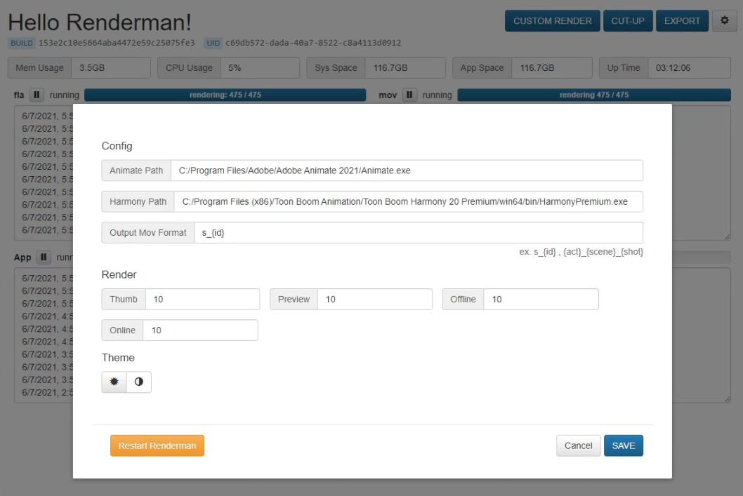 Renderman is a companion app to Animan. It runs on one or several local "Render PC(s)" controlled by your Studio to export production video, preview images, and thumbnails of Resources and Shots as instructed by Animan.
